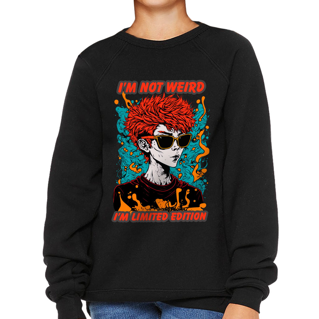 This remarkably soft pullover crewneck sweatshirt lends itself to daily wear and year-round layering. I Am Not Weird I’m Limited Edition Kids’ Raglan Sweatshirt features ribbed cuffs and a waistband, a crew neck, and a fashion-forward fleece fabrication.