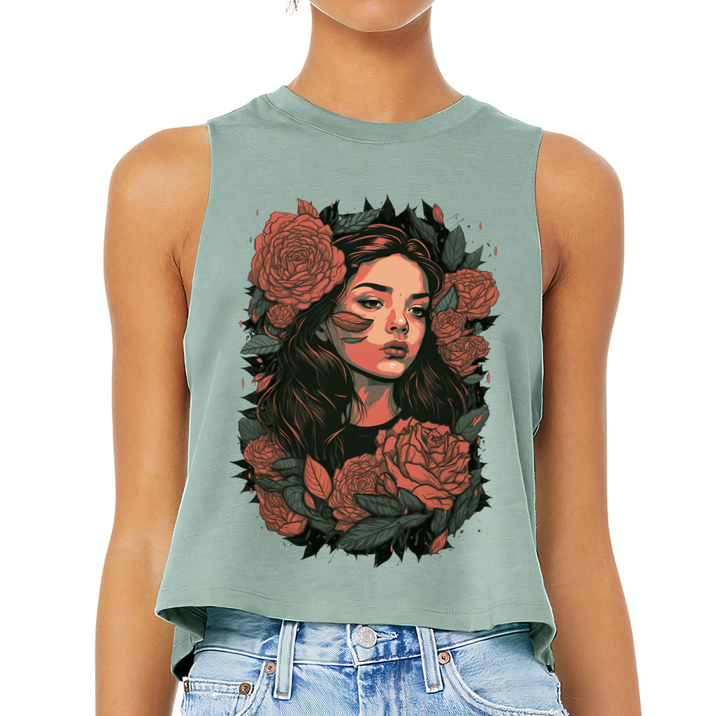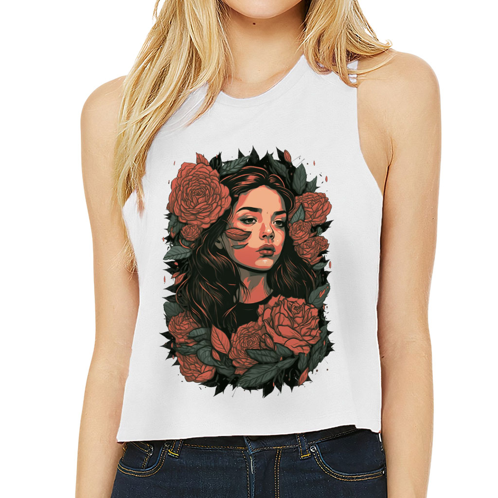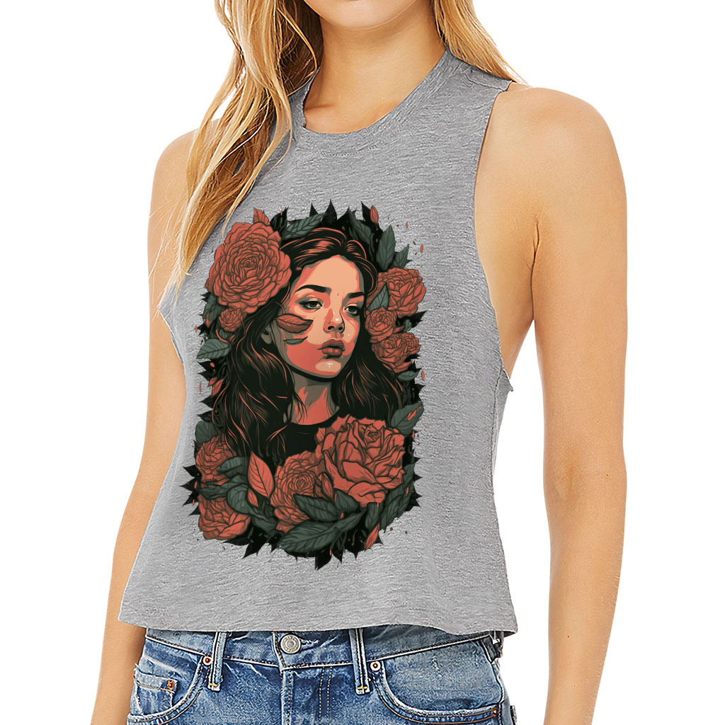 Rose Flower Racerback Cropped Tank is made of high-quality materials. 52/48 Airlume combed and ring-spun cotton/polyester jersey. Athletic Heather is 90/10 Airlume combed and ring-spun cotton/polyester jersey.