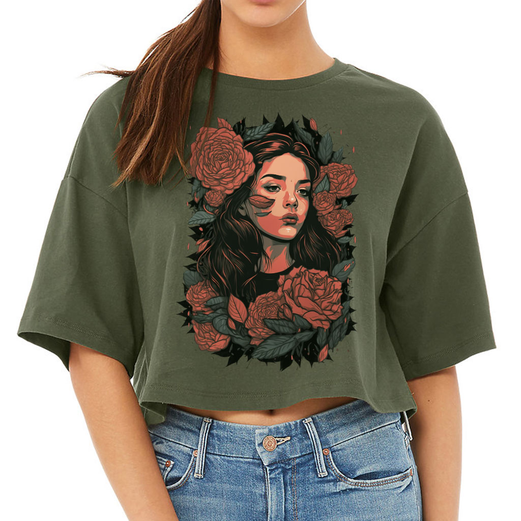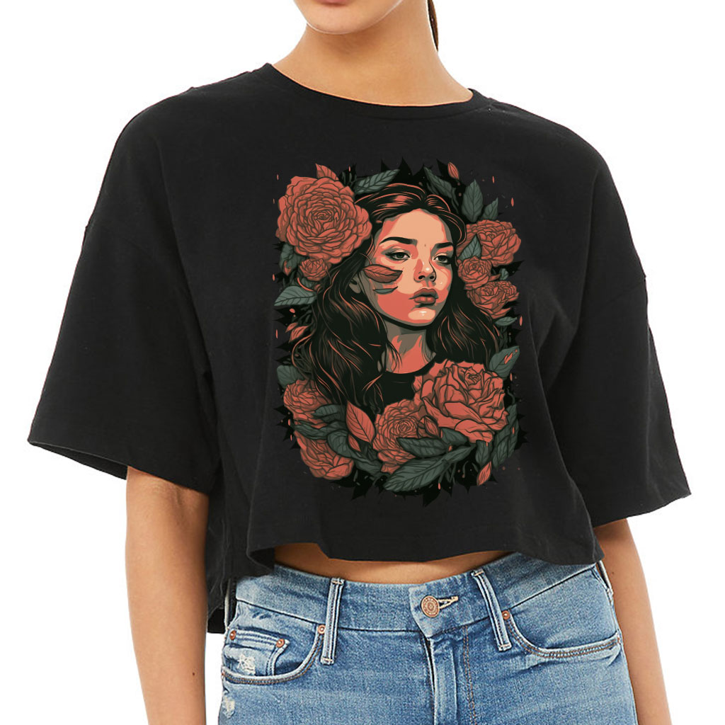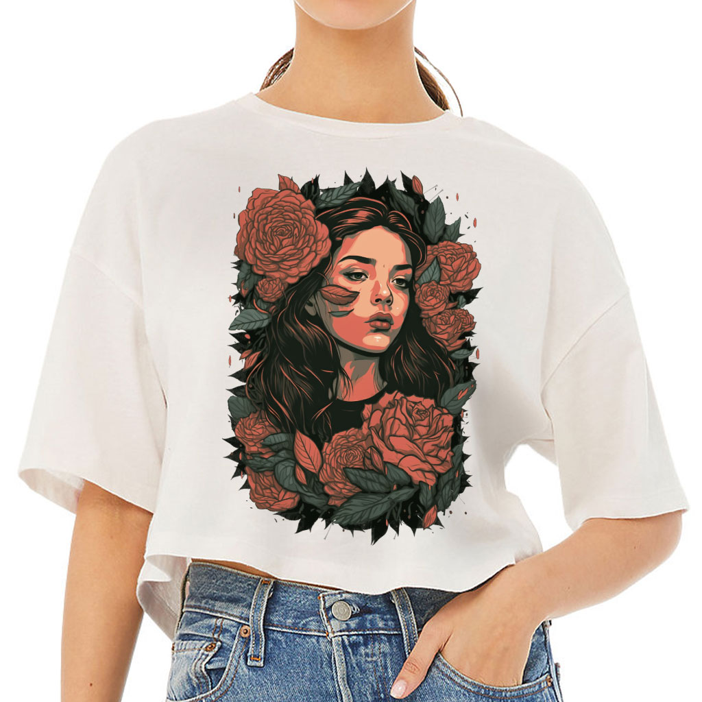 Rose Flower Women’s Crop Tee Shirt has a great look and cool fit. No matter what time of the year it is, you have a shirt for it all! This cropped t-shirt is the perfect way to make a statement. This t-shirt is made of soft cotton, which will not easily deform, and is breathable as well as comfortable, making you feel comfy all day.